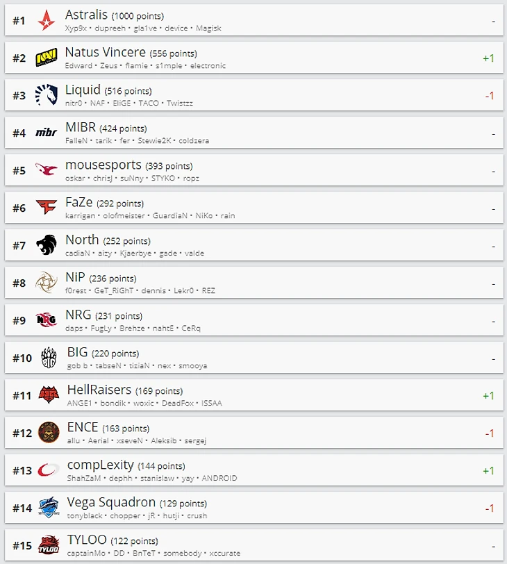 Natus Vincere вновь попали на второе место в списке. Hellraisers и Complexity также укрепили свои позиции в рейтинге. Сейчас они находятся на 11-м и 13-м месте соответственно. Хорошие выступления в онлайн-лигах позволили G2 Esports и Fnatic подняться в списке. Теперь команды занимают 16-ю и 22-ю строчку соответственно. Virtus.pro также поднялась в рейтинге и забралась на 27-ю позицию.