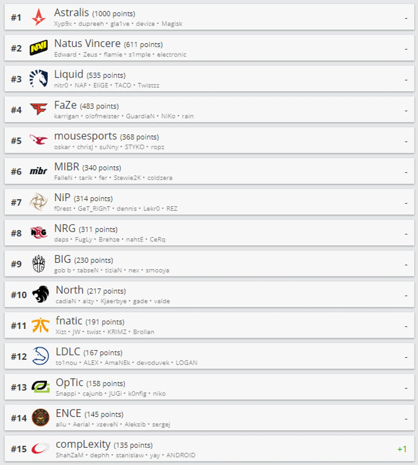 Hellraisers упали на 16-е место, а Vega Squadron – на 20-е. Несмотря на успешное попадание на СНГ-майнор, Gambit опустилась на 25-ю строчку. Tyloo также продолжила терять позиции в рейтинге. Сейчас китайская команда находится на 29-м месте.