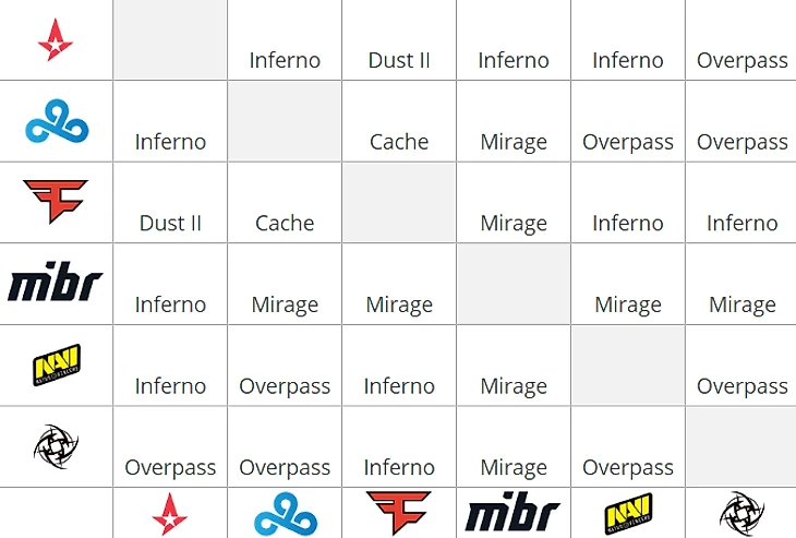 22:00 Na`Vi 16:12 NiP22:00 MIBR 14:16 Cloud922:00 Astralis 16:4 Faze Clan23:30 Faze Clan 12:16 Cloud923:30 MIBR 16:6 NiP23:30 Astralis 16:9 Na`Vi