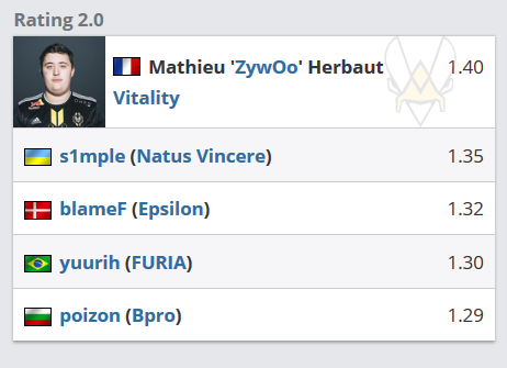 Игрок Team Vitality Мэтью «ZywOo» Эрбо обогнал игрока Na`Vi Александра «s1mple» Костылева по рейтингу 2.0.