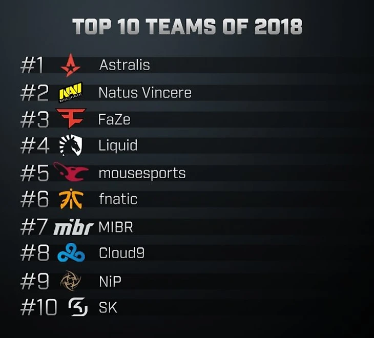 Победитель FACEIT London Major, ELEAGUE CS:GO Premier 2018 и Intel Grand Slam Season 1 Astralis заняла первое место. Natus Vincere, выигравшие StarSeries & i-League CS:GO Season 5, ESL One: Cologne 2018 и BLAST Pro Series: Copenhagen 2018, стали вторыми. Faze Clan, победившая на ESL One: Belo Horizonte 2018, IEM Sydney 2018 и EPICENTER 2018, замкнула первую тройку.