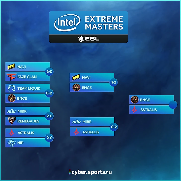 18:00 Na`Vi 1-2 Ence / Полуфинал21:50 Astralis 2-0 MIBR / Полуфинал