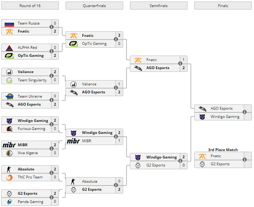 08:00 Fnatic 2-0 Optic Gaming11:00 Valiance 1-2 AGO14:00 Windigo 2-1 MIBR17:00 Absolute 0-2 G2