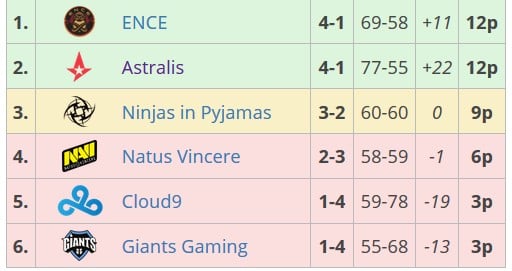 17:15 Giants 2-1 Monistar Riders / Финал Play-In21:45 Ence 16:4 Na`Vi21:45 Astralis 16:8 NiP21:45 Cloud9 16:14 Giants23:15 NiP 16:5 Ence23:15 Na`Vi 7:16 Cloud923:15 Astralis 16:7 Giants