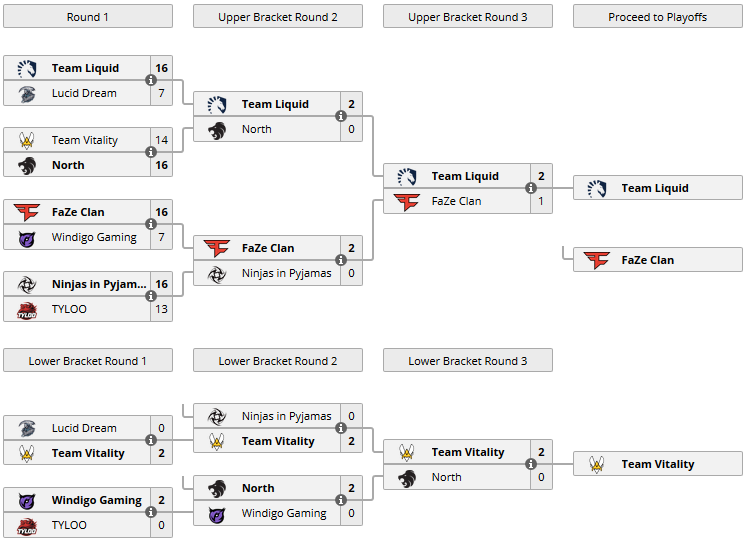 20:00 Team Liquid 16:7 Lucid Dream / Первый раунд группы A20:00 Team Vitality 14:16 North / Первый раунд группы A21:20 Faze Clan 16:7 Windigo / Первый раунд группы A21:20 Ninjas in Pyjamas 16:13 TyLoo / Первый раунд группы A22:45 Ence 16:4 Isurus Gaming / Первый раунд группы B 22:50 Renegades 17:19 G2 Esports / Первый раунд группы B