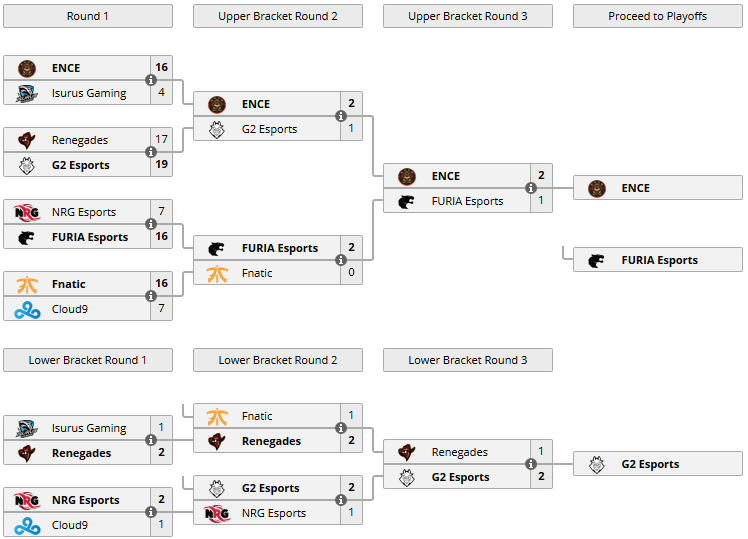 00:05 NRG 7:16 Furia / Первый раунд группы B 00:30 Fnatic 16:7 Cloud9 / Первый раунд группы B 1:30 Team Liquid 2-0 North / Первый раунд верхней сетки группы A1:30 Lucid Dream 0-2 Team Vitality / Первый раунд нижней сетки группы A3:35 Windigo 2-0 TyLoo / Первый раунд нижней сетки группы A4:20 Faze Clan 2-0 Ninjas in Pyjamas / Первый раунд верхней сетки группы A20:00 Isurus 1-2 Renegades / Первый раунд нижней сетки группы B20:00 NRG 2-1 Cloud9 / Первый раунд нижней сетки группы B23:40 Team Vitality 2-0 Ninjas in Pyjamas / Второй раунд нижней сетки группы A23:40 Ence 2-1 G2 Esports / Первый раунд верхней сетки группы B