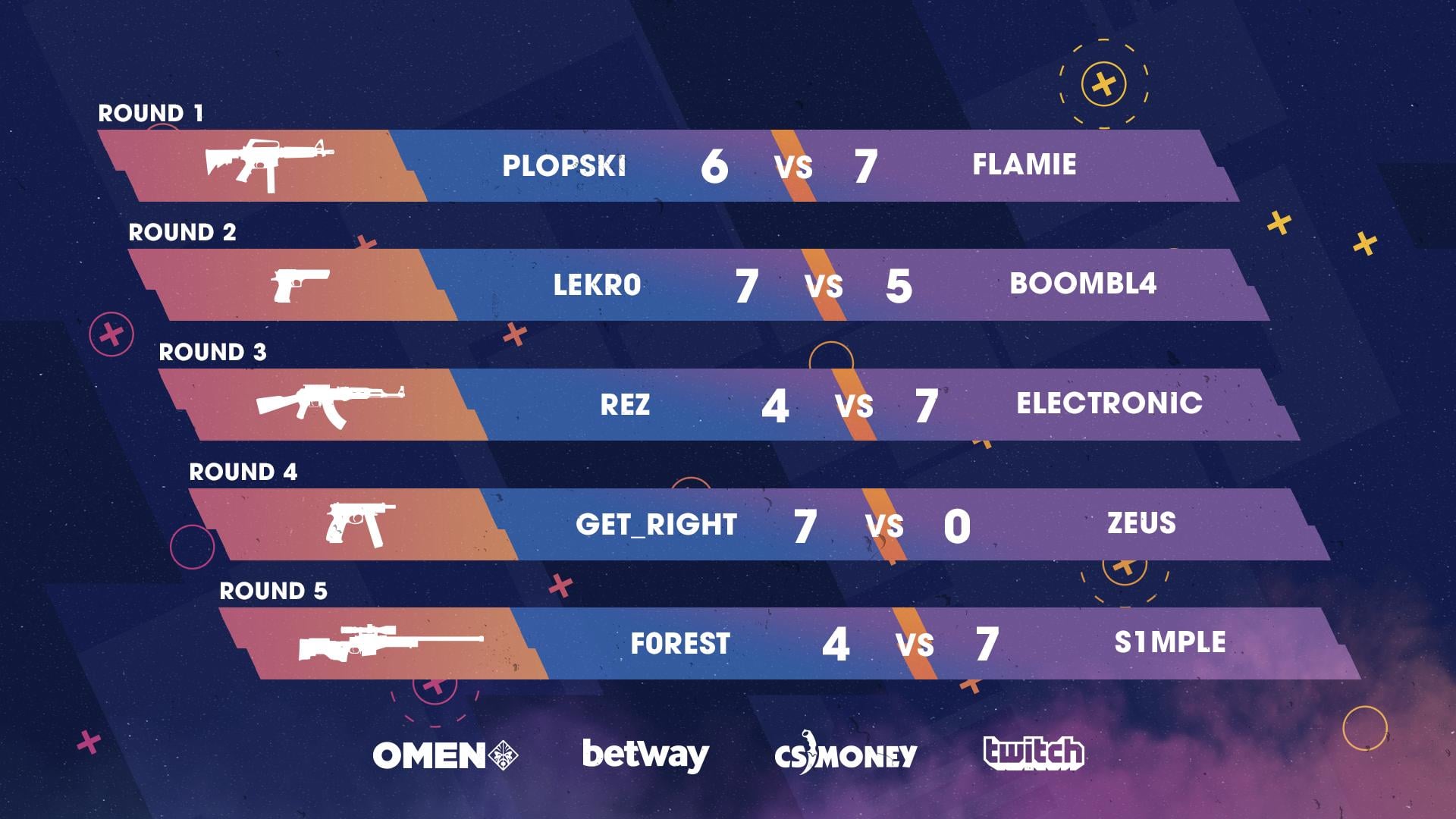 Игроки провели 5 дуэлей 1х1 на M4A4/M4A1-S, Desert Eagle, AK47, CZ75 и AWP.