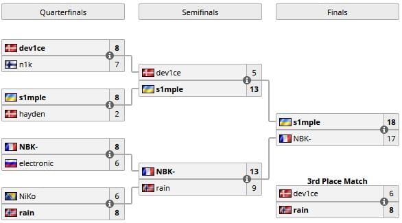 Участники разыграли 50 тысяч долларов. Александр «s1mple» Костылев за победу получил 30 тысяч долларов, Натан NBK Шмитт занял второе место и заработал 12,5 тысячи, Хаваарду «rain» Найгарду за третье место полагается 7,5 тысячи.