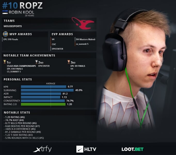 Игрок Mousesports Робин «ropz» Коль занял 10-е место в рейтинге игроков за 2019 год от HLTV.
