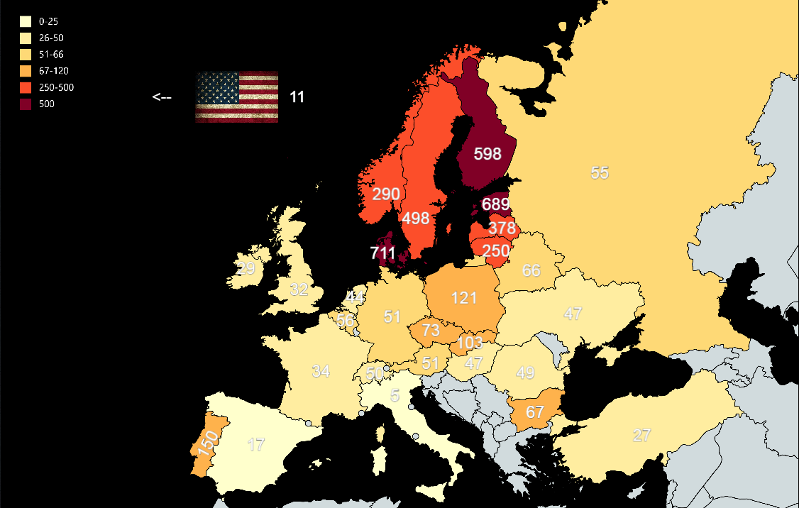 На карте изображено число игроков 10 уровня в лиге FACEIT на один миллион жителей страны. Лидируют по этому показателю Дания (711 игроков на 1 млн жителей), Эстония (689 игроков) и Финляндия (598 игроков).