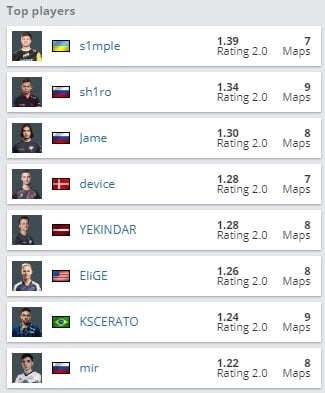 Общий рейтинг Костылева – 1,39. В топ-3 попали снайперы Gambit и Virtus.pro – Дмитрий «Sh1ro» Соколов (1,34) и Джами «Jame» Али (1,30).