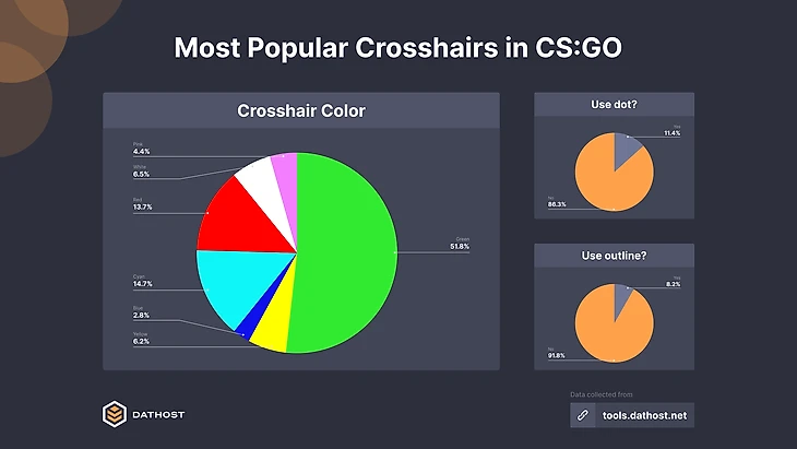 Помимо готовых прицелов были также опубликованы топы с самыми популярными размерами, цветами и интервалами. Львиная доля пользователей отдала предпочтение зеленому цвету.