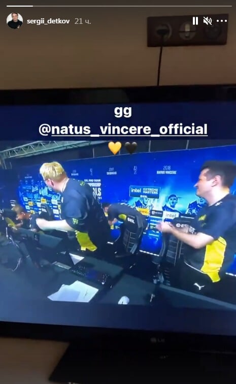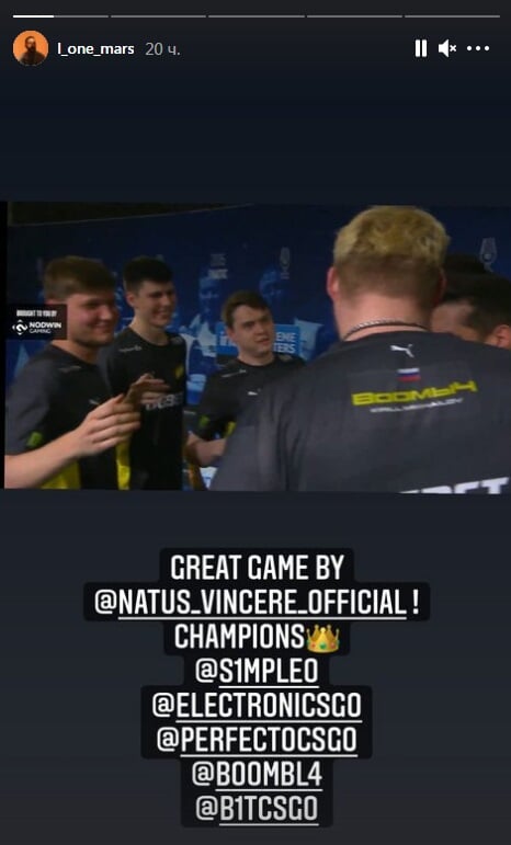 L’One запостил в сторис скриншот с трансляции финальной серии против G2 с подписью «Отличная игра от NAVI! Чемпионы 👑». Аналогичное видео опубликовал и Детков, также смотревший гранд-финал турнира.