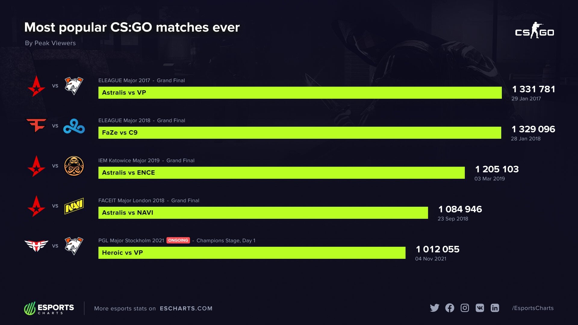 Матч преодолел отметку в 1 млн зрителей и вошел в топ-5 по популярности за всю историю CS:GO. Больше зрителей собирали только финалы мейджоров – лидирует матч Virtus.pro – Astralis в гранд-финале ELEAGUE Major 2017.