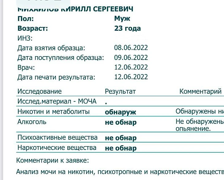 Как следует из скриншота, алкоголя, психоактивных и наркотических веществ в организме Бумыча обнаружено не было. Дата взятия образца – 8 июня 2022 года.