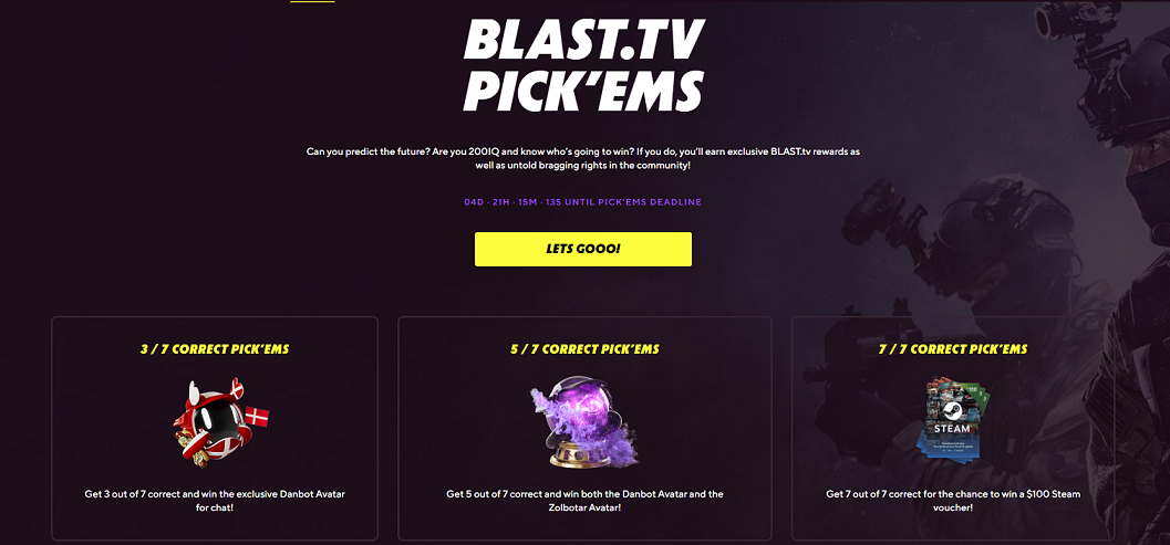 В преддверии BLAST Premier Fall Final 2022 турнирный оператор добавил на сайт вкладку с прогнозами – те, кто правильно отгадают результаты всех матчей, получат 100$ на Steam.