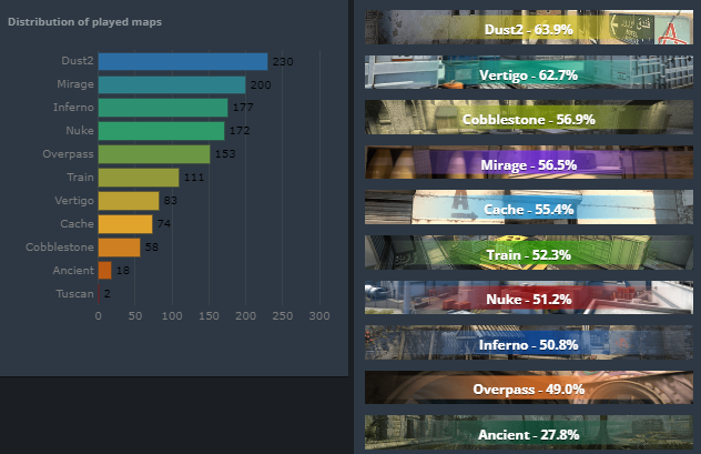 Dust 2 является лучшей картой BIG. На ней клуб имеет 230 официально сыгранных карт с винрейтом 63,9%.