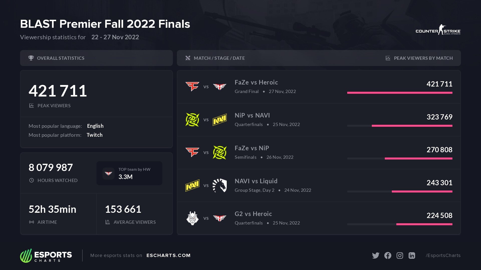Пиковый онлайн гранд-финала BLAST Premier Fall Finals 2022 составил 421 711 зрителей.