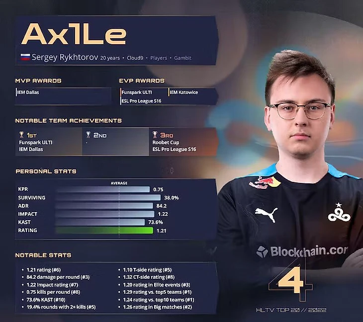 Игрок Cloud9 Сергей «Ax1le» Рыхторов занял 4-ю строчку в рейтинге лучших игроков 2022-го по версии HLTV.