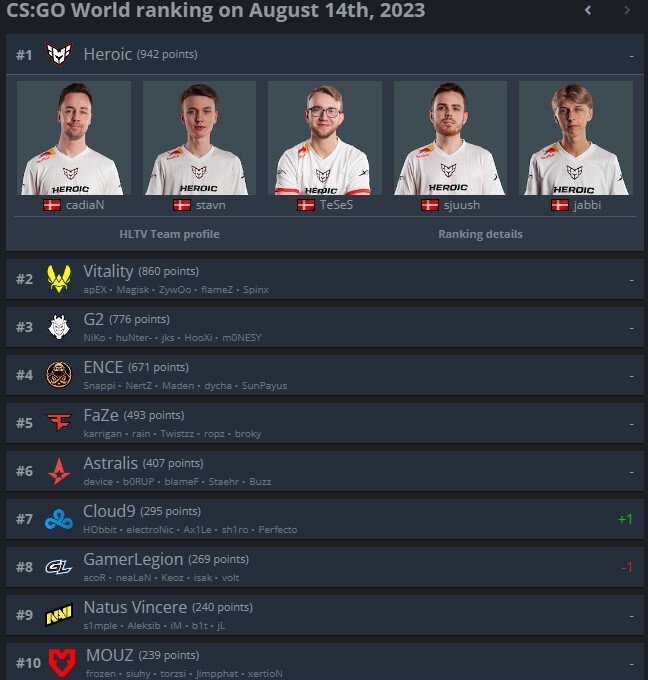 Рейтинг HLTV остался без изменений после обновления в начале недели – Heroic осталась на первом месте.
