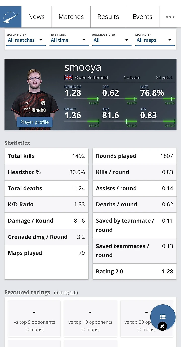 Игрок приложил скриншот своей статистики с HLTV – все ключевые показатели отмечены зеленым цветом. Рейтинг Смуи по версии HLTV – 1,28.