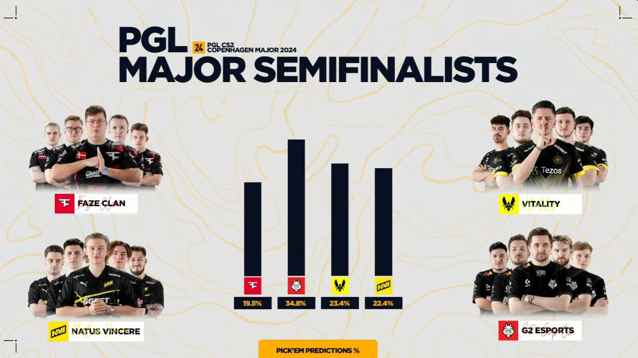 Всего среди оставшихся команд больше всего игроки верят в победу G2 (34,8%). Далее идет Vitality (23,4%), NAVI (22,4%) и Faze (19,5%).