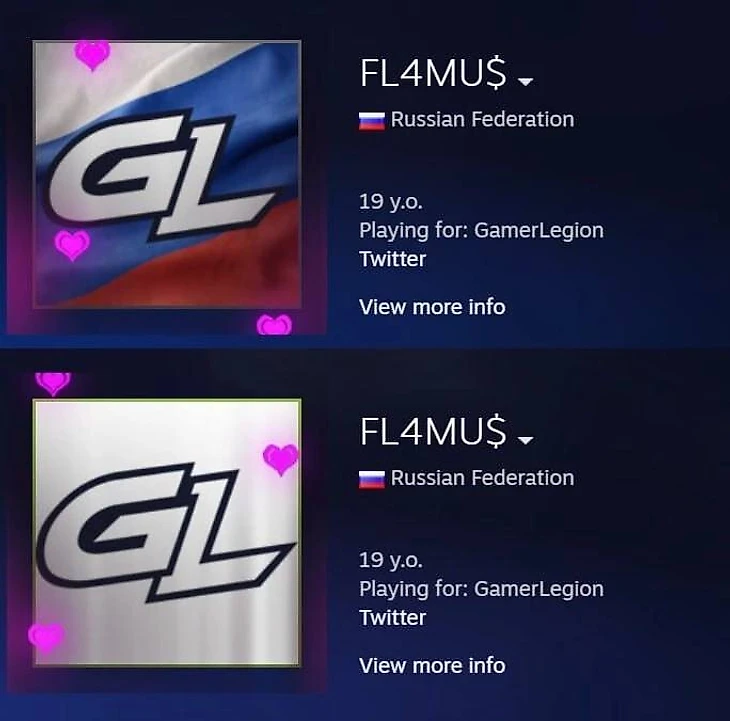 19-летний россиянин Тимур «FL4MUS» Марьев, ранее перешедший из Nemiga в GamerLegion, поставил аватарку с российским флагом и эмблемой GL в свой профиль Steam.