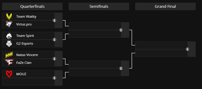 В четвертьфинале Spirit сыграет против G2, NAVI – против Faze, Virtus.pro – против Vitality. Mouz встретятся с победителем стадии Last Chance.
