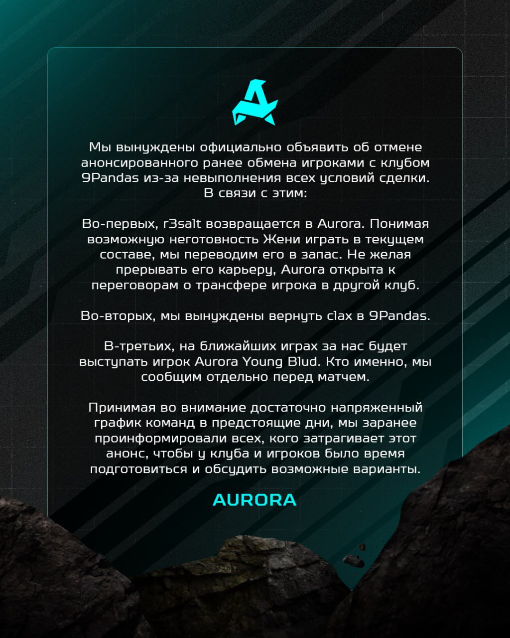 «Мы вынуждены официально объявить об отмене анонсированного ранее обмена игроками с клубом 9Pandas из-за невыполнения всех условий сделки», – говорится в заявлении Aurora.