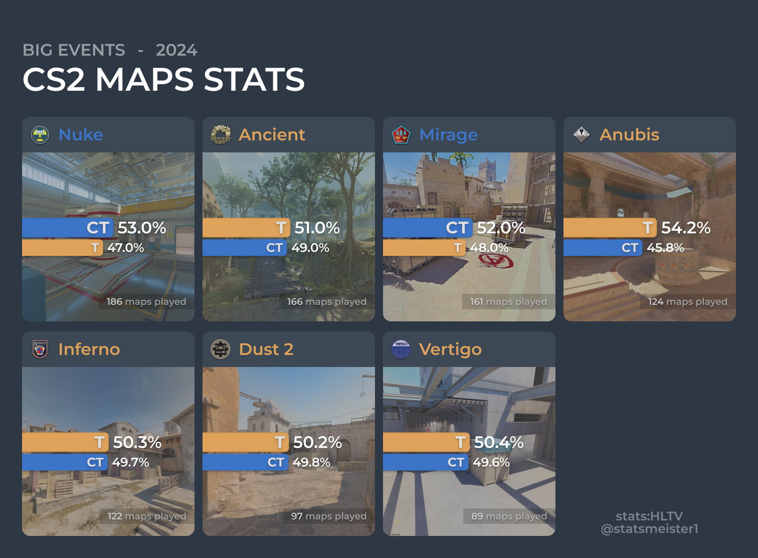 Больше всего раундов сторона защиты берет на Nuke, сторона атаки – на Anubis.