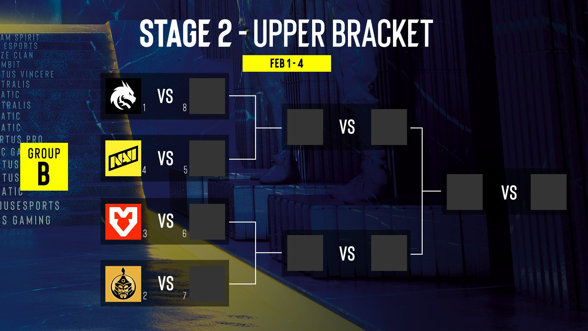 Группа В: Spirit, NAVI, The Mongolz, Mouz, 4 команды из Play-In.