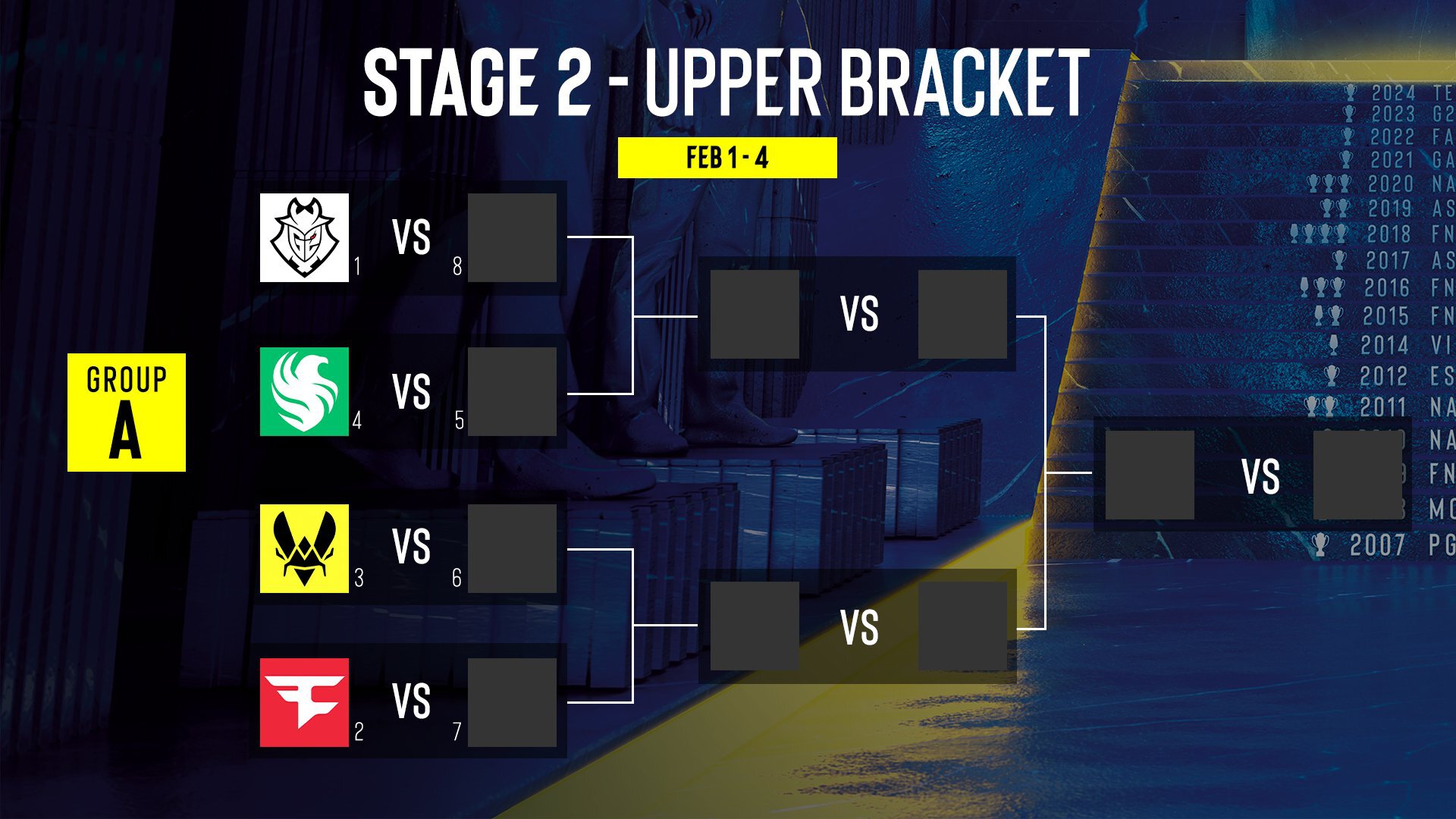 Группа А: G2, Falcons, Vitality, Faze, 4 команды из Play-In.