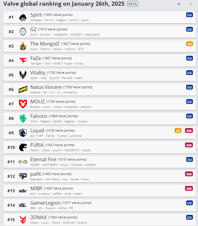 После победы обновился рейтинг команд от Valve – Spirit заняла 1-е место.