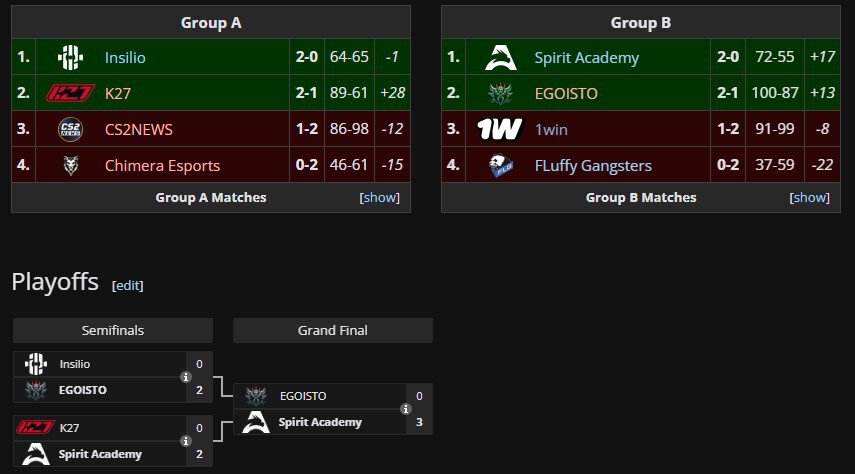 20:00 Spirit Academy 2-1 Egoisto / матч за выход в плей-офф в группе B