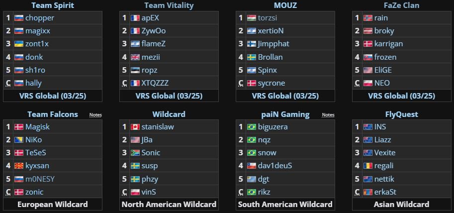 Участники: Spirit, Vitality, Mouz, Faze, Falcons, Wildcard, Pain, FlyQuest.