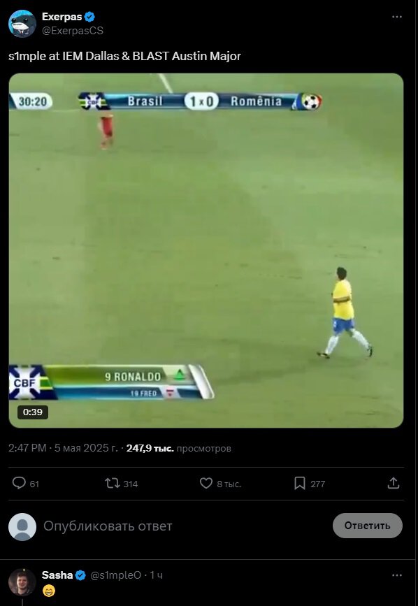 • S1mple отреагировал на сравнение его перехода Faze с прощальным матчем Роналдо за сборную Бразилии по футболу