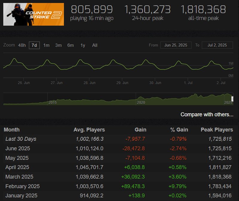 Тем не менее, средний онлайн в CS 2 все еще больше 1 млн игроков.