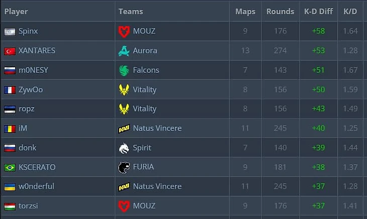 По разница убийств и смертей лучшим стал Лотан «Spinx» Гилади (+58). Следом расположились Исмаилджан «Xantares« Дерткардеш (+53) и Илья «M0nesy» Осипов (+51).