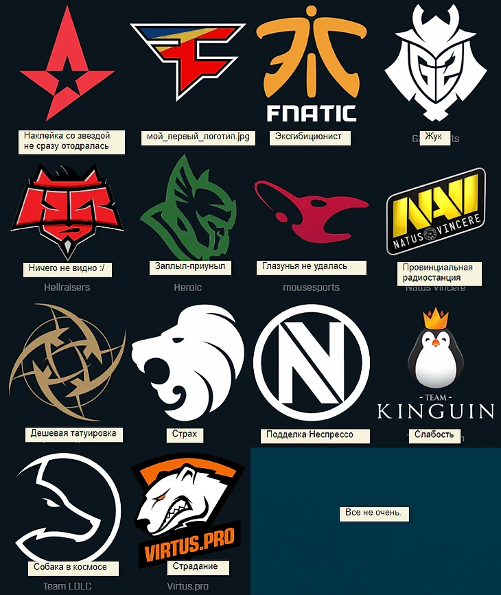 Как теперь это развидеть?Студии известного дизайнера Артемия Лебедева поступил интересный вопрос:«Сейчас идет киберспортивный чемпионат мира по КС. Оцените дизайн эмблем команд-участников. Все говно и детский сад? Или есть эмблемы, которые было бы не стыдно использовать и традиционным спортивным командам международного уровня?» Рецензия члена студии довольно лаконична (и не спрашивайте, что за «чемпионат мира по КС»).