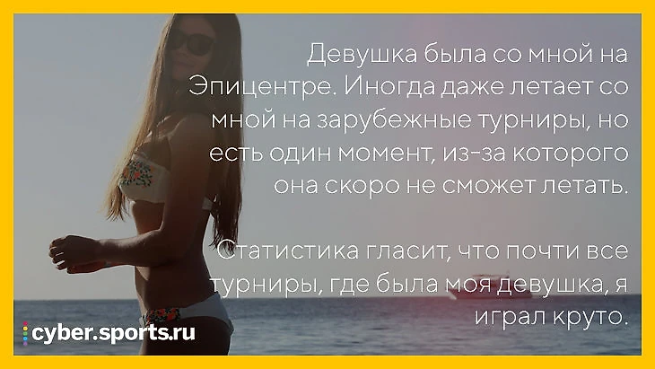 – Статистика гласит, что почти все турниры, где была моя девушка, я играл круто. За исключением Starladder в Киеве, который мы проиграли Mousesports. А так, на всех турнирах с ней мы были в финале. Даже на WESG в составе Team Russia я играл шикарно, и мы заняли третье место. Обычно она следит за моим распорядком дня, когда я на турнире.