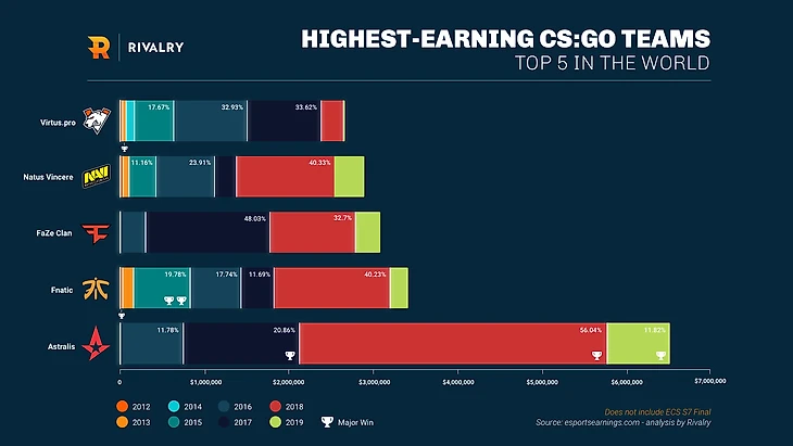 Мы часто слышим жалобы комьюнити и про-игроков, которые требуют от Valve аналог TI с большим призовым фондом, но в плане финансов у CS:GO все не так уж и плохо. Понятно, в сравнении с Дотой приведенные цифры кажутся смешными, но по крайней мере есть прогресс. Большие изменения внес Intel Grand Slam в 2018 году, после чего выигравшие его Astralis существенно оторвались в топе финансово-успешных организаций.