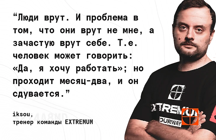 Дима Iksou: «Во-первых, люди врут. И проблема в том, что они врут не мне, а зачастую врут себе. Т.е. человек может говорить: «Да, я хочу работать»; но проходит месяц-два, и он сдувается. Или изначально кажется милым и порядочным человеком, а через пару месяцев начинает вести себя токсично. Та же история с людьми, которые изначально кажутся умными, но за несколько месяцев не способны пофиксить ни одной ошибки».