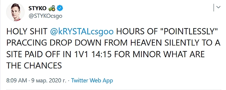 Судя по всему, Кристал действительно потратил много времени, чтобы довести этот мув до идеала. О маниакальном увлечении капитана такими прыжками рассказал игрок команды Styko: «Твою мать, часы «бессмысленных» тренировок тихого падения с девятки на точку от Кристала наконец-то оправдали себя. Это случилось в ситуации 1 на 1 при счете 15:14 на раунде, который решал выход на майнор. Каковы были шансы?».