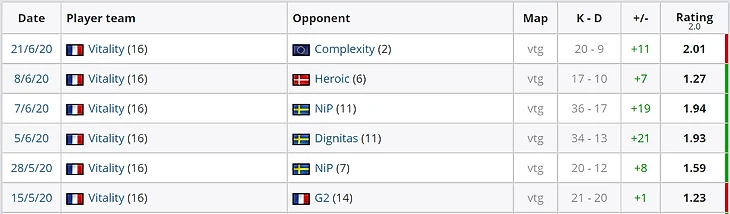 За поражением Vitality в финале BLAST Premier Spring многие не заметили, что ZywOo в очередной раз провел феноменальную игру на Vertigo. Сейчас француз однозначно лучше всех на топ-уровне понимает эту карту. Только посмотрите на его статистику на ней за последние 6 игр.