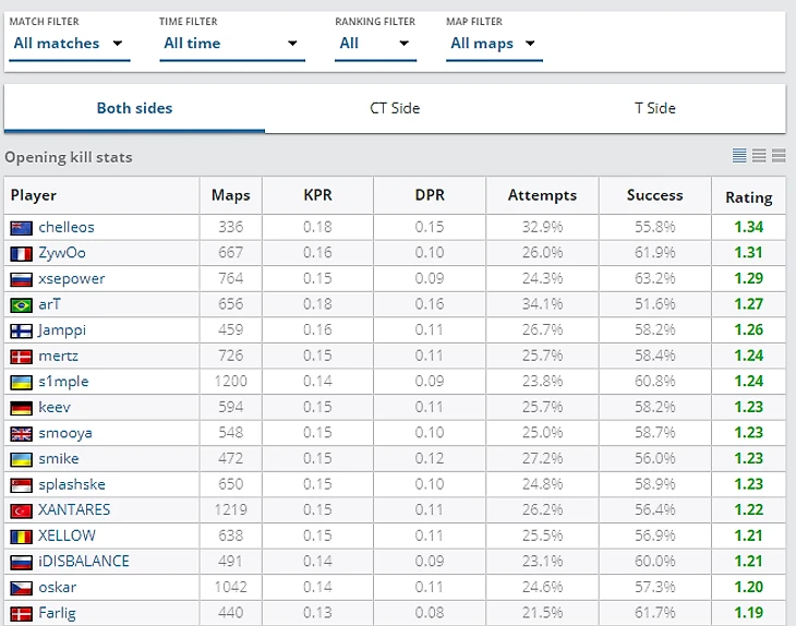 Давайте вернемся к тому, какую стату HLTV предоставляет по первым дуэлям отдельных игроков.