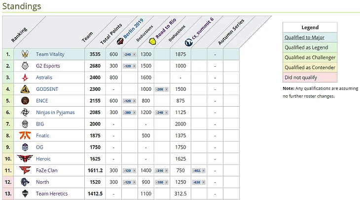 С приходом Kjaerbye команда потеряла 20% очков – теперь у них лишь 1611,2. С 7-го места Faze упала на 11-е, и в случае провала на третьем европейском отборочном турнире у Фейз все шансы оказаться не попасть даже в первый этап мейджора. Учитывая большую конкуренцию в регионе, одного прямого конкурента за место и не самое лучшее выступление в июне, риск довольно велик.