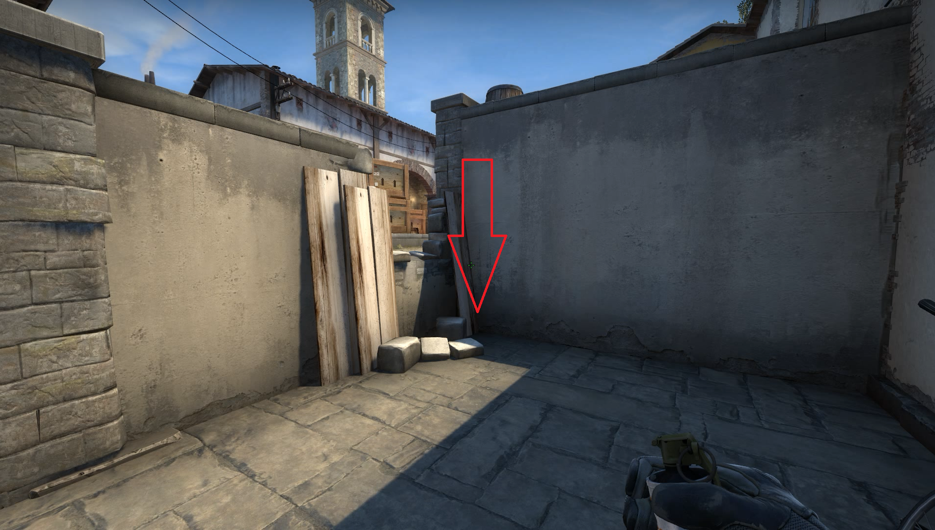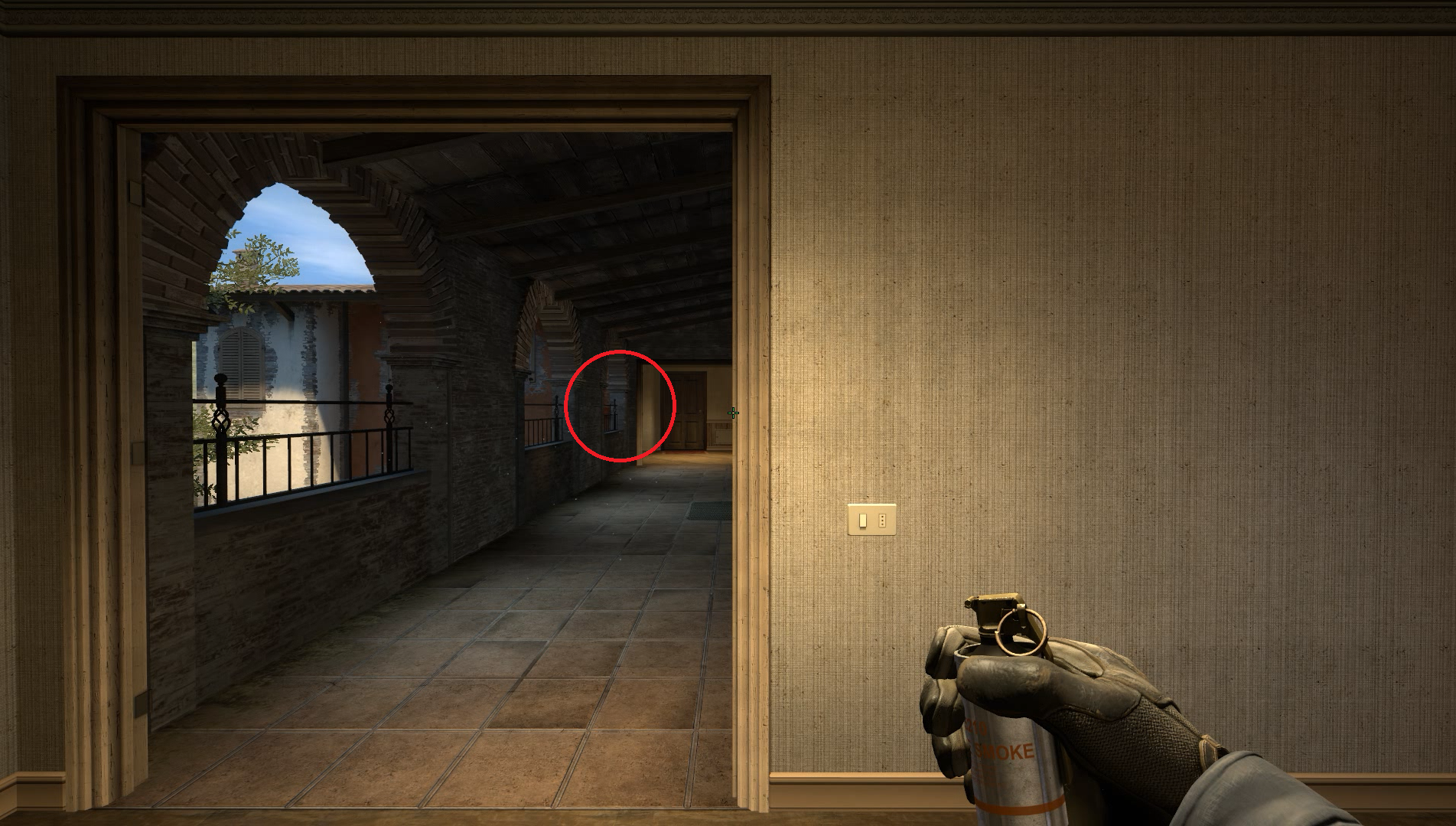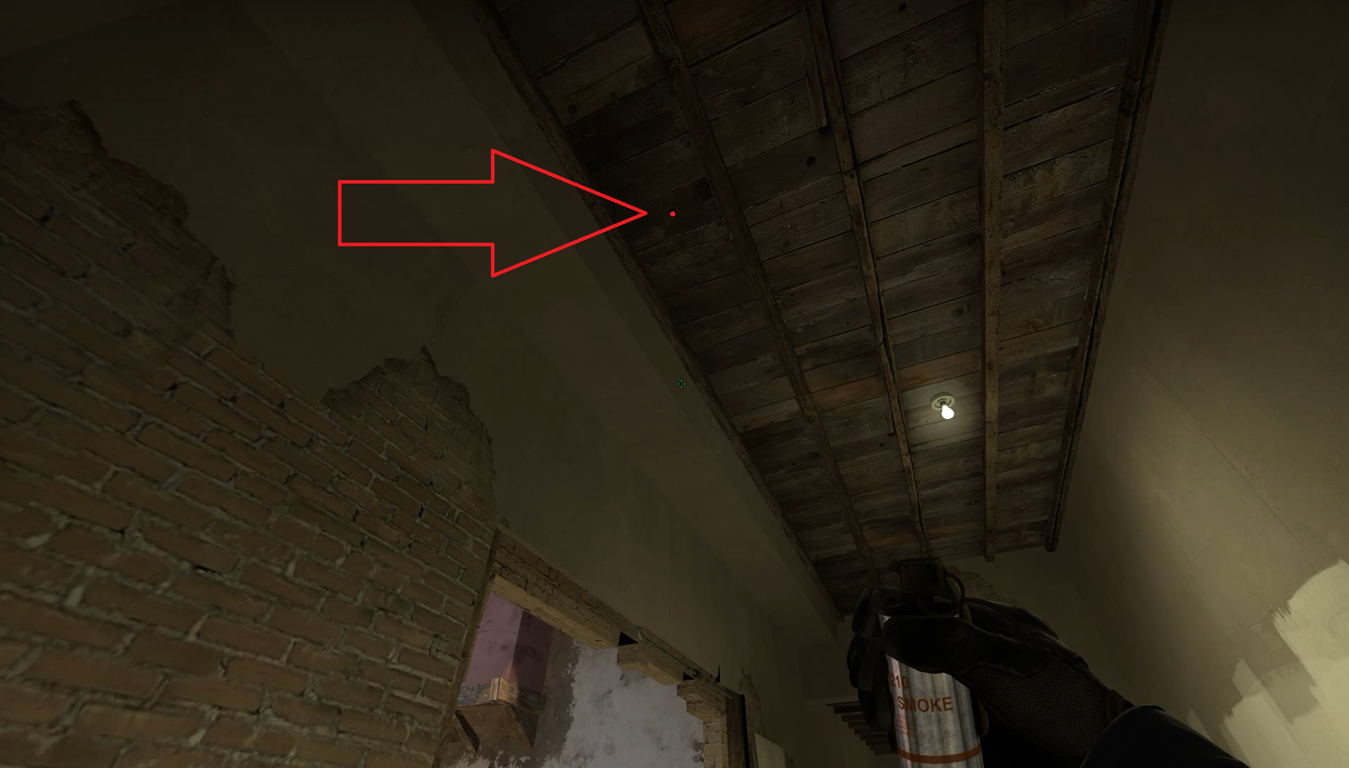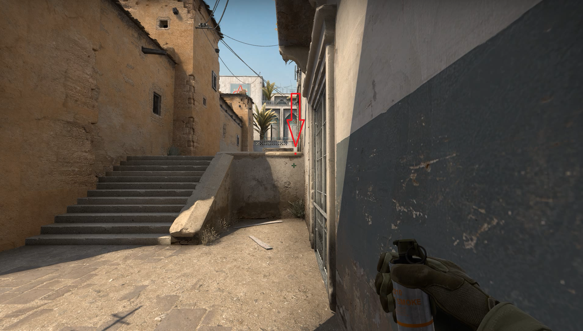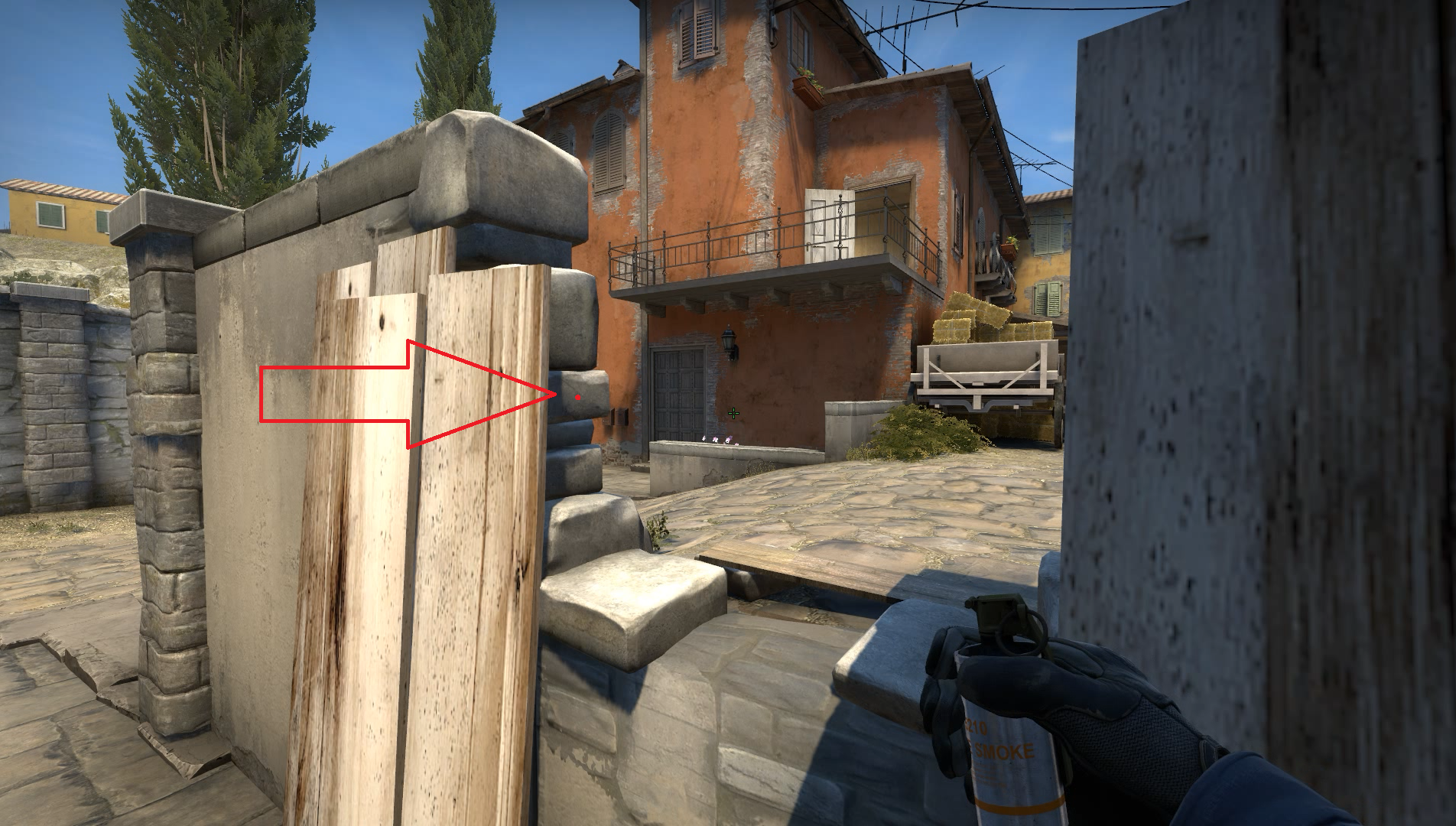 Целимся в середину бордюра, который находится прямо под проемом. Кидаем смок с места.
