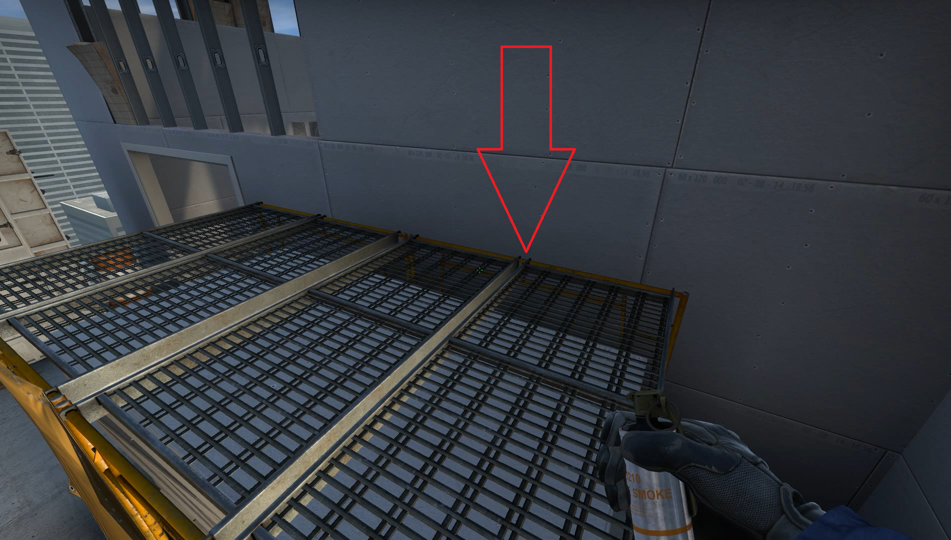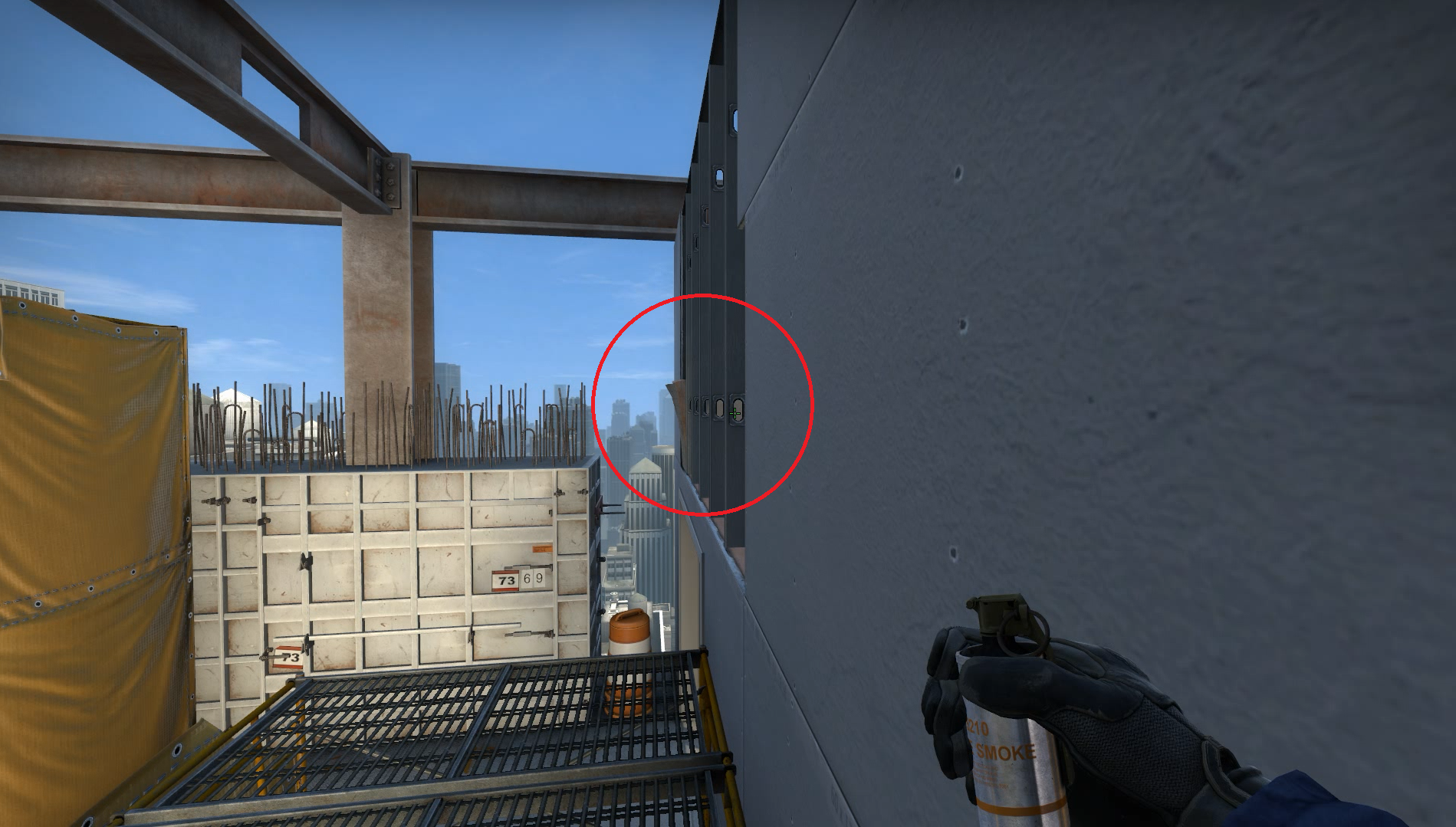 Ищем пересечение между самой левой балкой и прилегающей к ней. Целимся в эту точку и кидаем смок, стоя на месте.
