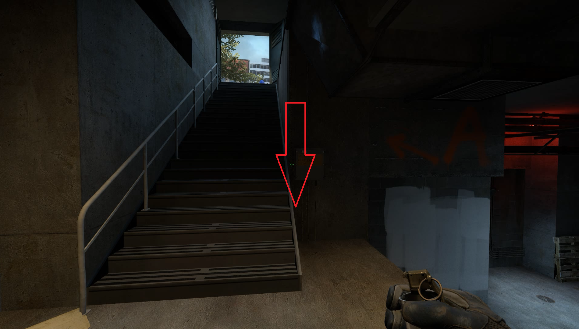 Нам нужно прицелиться в середину этой небольшой черной фигуры, которая похожа на перевернутую букву «Т». Далее кидаем смок с места, встаем в позицию справа от лестницы и наблюдаем за выходящими соперниками, которым будет очень непросто вас найти.