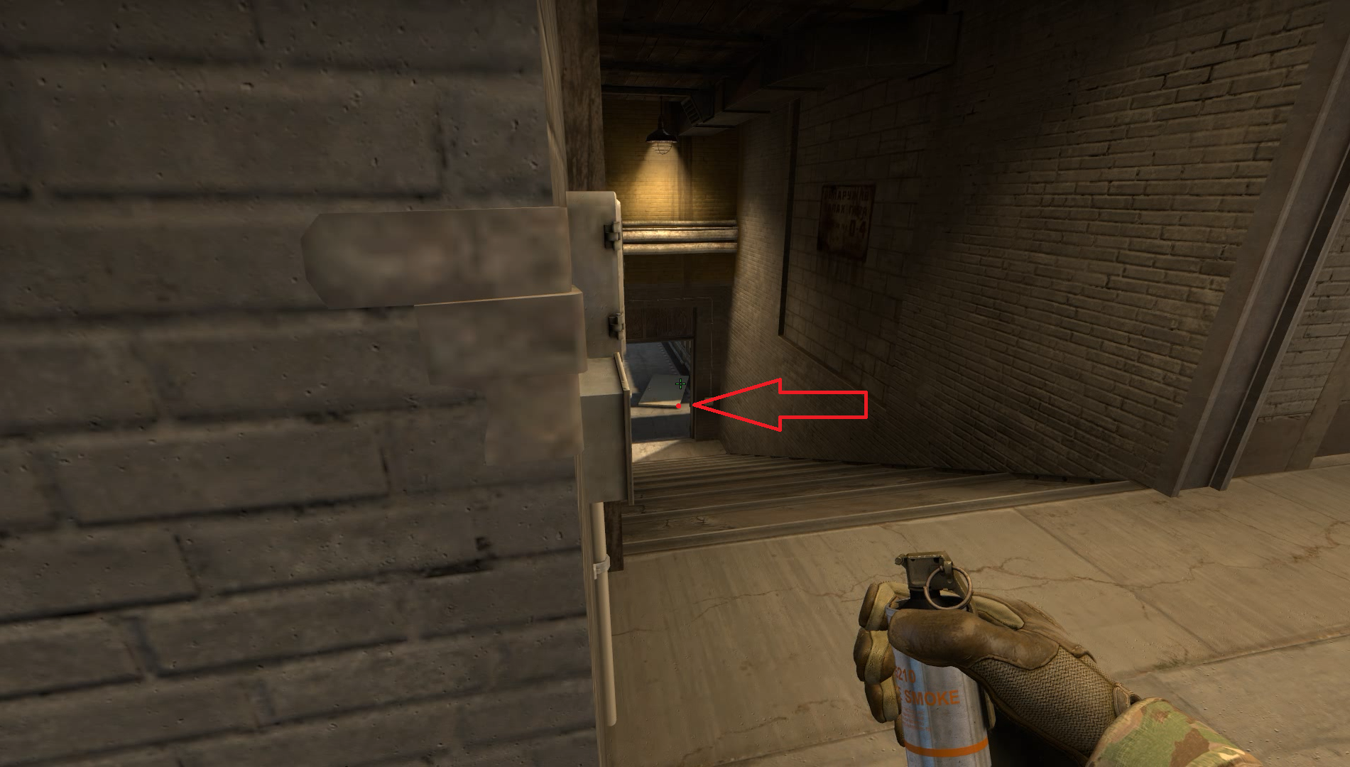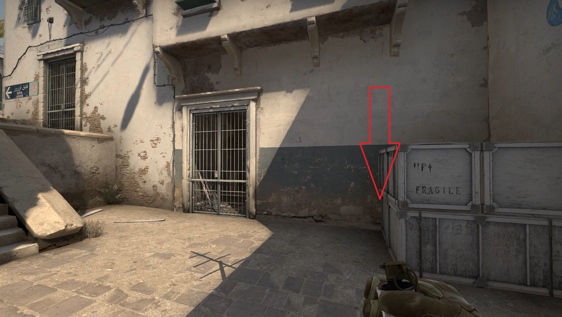 Победить опорников точки А на Dust2 будет гораздо проще, если бросить на шорт такой смок. Он позволяет игрокам атаки выглянуть через угол и увидеть врагов через край дыма. Для такой раскидки встаем в угол между стеной и большим ящиком.